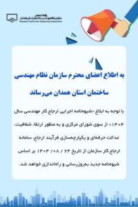 به اطلاع اعضای محترم سازمان نظام مهندسی ساختمان استان همدان میرساند، با توجه به ابلاغ «شیوهنامه اجرایی ارجاع کار مهندسی سال ۱۴۰۴» از سوی شورای مرکزی و به منظور ارتقاء شفافیت، عدالت حرفهای و یکپارچهسازی فرآیند ارجاع، سامانه ارجاع کار سازمان از تاریخ ۲۴ /۰۸/ ۱۴۰۴ بر اساس شیوهنامه جدید بهروزرسانی و راهاندازی خواهد شد. لذا از کلیه اعضای محترم تقاضا میشود نسبت به موارد زیر توجه فرمایند: